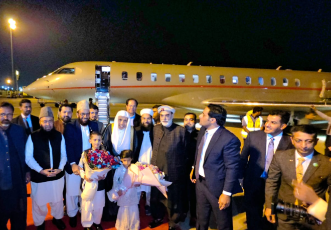 استقبالی وفد میں پاکستان میں تعینات سعودی عرب کے سفیر نواف سعید المالکی، وفاقی سیکریٹری مذہبی امور ڈاکٹر عطا الرحمن، سینیٹر حافظ عبدالکریم، سینیٹر طلحہ محمود، چیئرمین پاکستان علما کونسل حافظ طاہر اشرفی اور رابطہ عالم اسلامی کے پاکستان میں کنٹری ہیڈ سعد مسعود الحارثی بھی شامل تھے۔