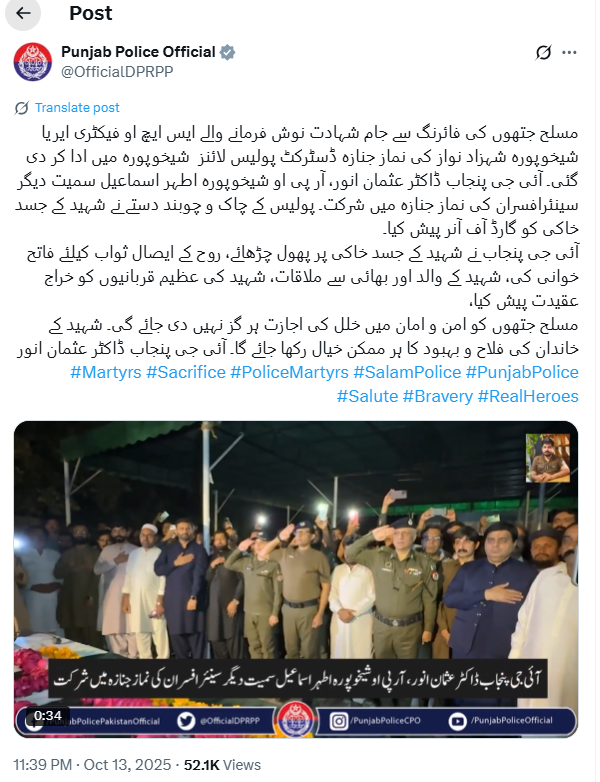 احتجاج کے دوران ہلاک ہونے والے ایس ایچ او شہزاد نواز کی نماز جنازہ منگل کو ڈسٹرکٹ پولیس لائنز شیخوپورہ میں ادا کی گئی۔
