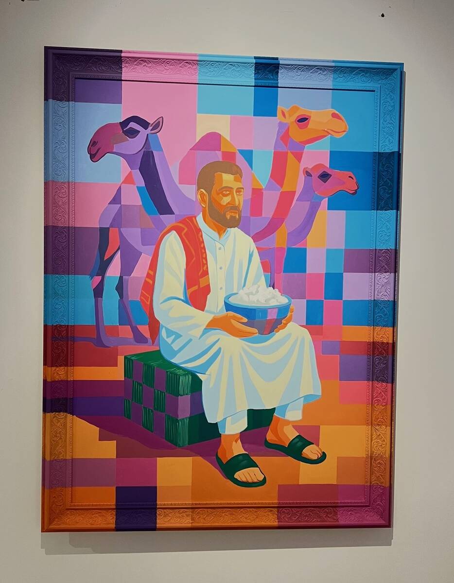 اپنی پینٹنگ ’ایج آف دی یونیورس‘ میں وہ ایک شخص کو دکھاتے ہیں جو ایک سجے ہوئے فرش پر بیٹھا ہے، اردگرد اونٹوں کی تصویریں ہیں، اور وہ اونٹ کے دودھ کا پیالہ تھامے ہوئے ہیں جو مہمان نوازی کی علامت ہے۔