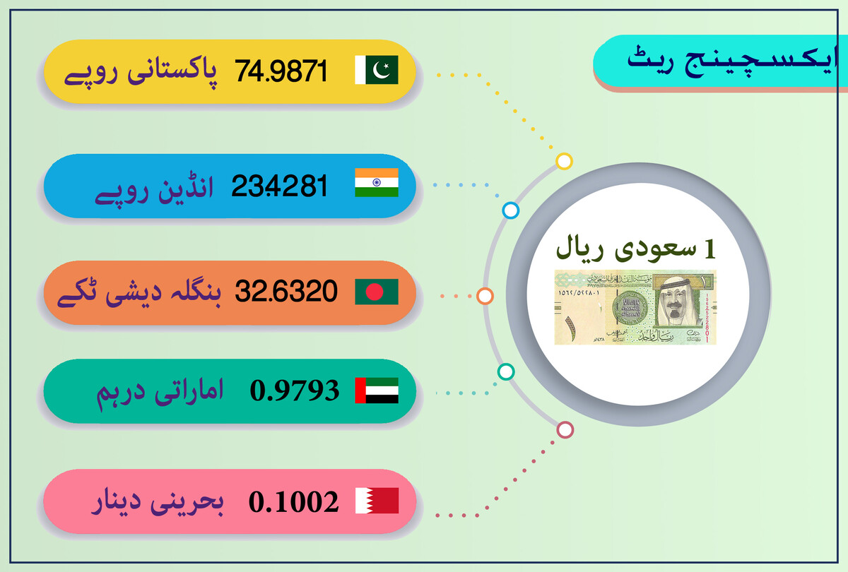 سعودی عرب کے مختلف ٹرانزیکشن سنٹرز کے مطابق اتوار 26 اکتوبر 2025 کو سعودی ریال کا ایکسچینج ریٹ ذیل میں درج کیا گیا ہے۔