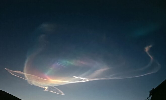 تصاویر اور ویڈیو میں نظر آرہا ہے کہ بادل پرندوں کی طرح پھیلے ہوئے ہیں، اندر سے رنگ برنگی روشنی چمک رہی ہے اور کچھ سفید دھاریاں (جیسے دم) بھی نظر آرہی ہے۔