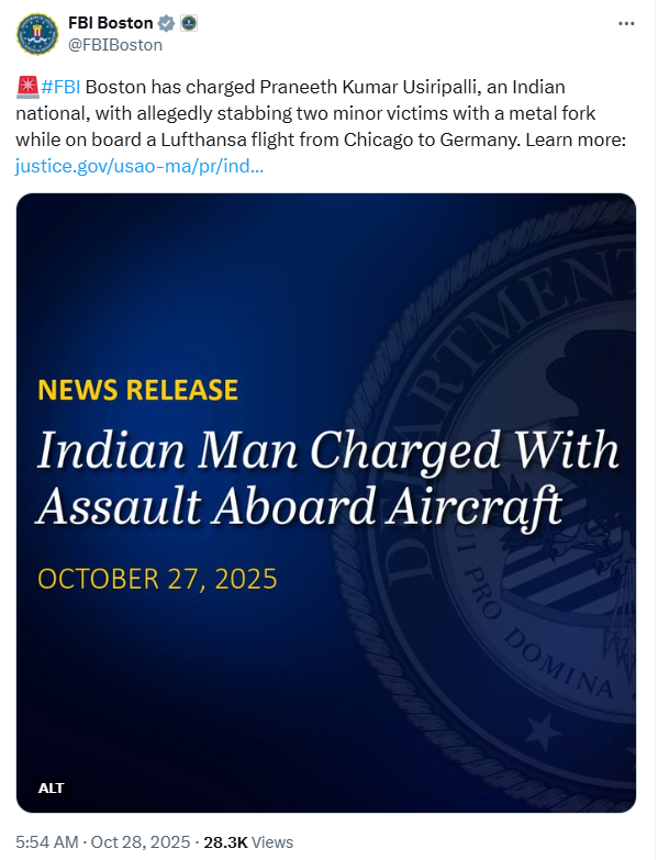 امریکی اٹارنی کے دفتر برائے ڈسٹرکٹ آف میساچوسٹس کی جانب سے جاری کردہ بیان کے مطابق امریکہ میں ایک انڈین شہری پرنیت کمار اوسری پالی پر الزام عائد کیا گیا ہے کہ اُس نے شکاگو سے جرمنی جانے والی لفتھانزا ایئرلائن کی ایک پرواز کے دوران دو نوعمر مسافروں کو ایک دھاتی کانٹے سے زخمی کیا اور ایک مسافر کو تھپڑ مارا۔