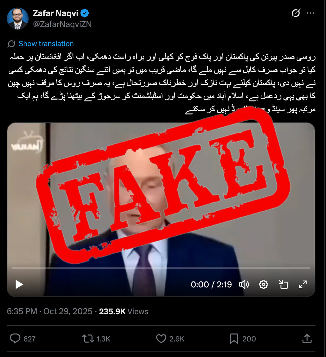 A video in which Russian President Vladimir Putin allegedly threatens Pakistan amid Pakistan-Afghanistan tensions is 100% FAKE.