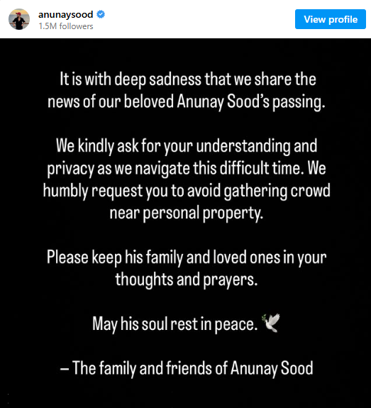 ان کے انسٹاگرام اکاؤنٹ پر جاری کردہ بیان میں ان کے غمزدہ خاندان نے لکھا کہ ’یہ انتہائی افسوس کے ساتھ ہم اپنے پیارے انونے سُود کے انتقال کی خبر آپ سے شیئر کر رہے ہیں۔‘