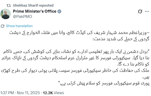 ان کے مطابق ’عوام اور سکیورٹی فورسز کی قربانیاں رائیگاں نہیں جائیں گی، امن دشمنوں کا ہر جگہ پیچھا کیا جائے گا۔‘