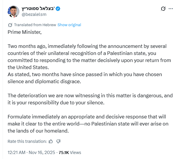 سموترچ نے ایکس پر نیتن یاہو کو مخاطب کرتے ہوئے کہا کہ ’فوراً ایک واضح اور ٹھوس جواب دیں، تاکہ دنیا جان لے کہ ہماری سرزمین پر کبھی کوئی فلسطینی ریاست وجود میں نہیں آئے گی۔‘