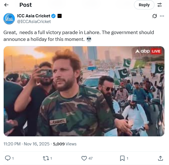 انٹرنیٹ کرکٹ سرکٹ نامی اکاؤنٹ نے تنقید کرتے ہوئے لکھا کہ ’بہت اعلی، اس خوشی میں لاہور میں وکٹری پریڈ ہونی چاہیے اور حکومت کو چھٹی کا اعلان کرنا چاہیے۔‘
