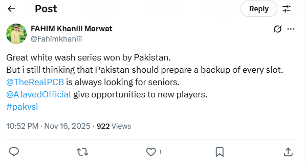 فہیم خان مروت نے لکھا کہ ’پاکستان کا سیریز میں مخالف ٹیم کو وائٹ واش کرنا عمدہ ہے لیکن ضرورت اس امر کی ہے کہ پاکستان ہر سلاٹ کے لیے بیک اپ رکھے۔‘