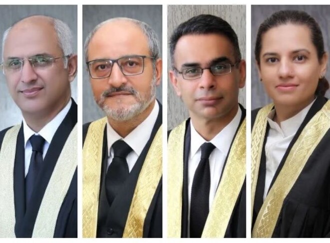 جسٹس محسن اختر کیانی، جسٹس بابر ستار، جسٹس ثمن رفعت امتیاز اور جسٹس سردار اعجاز اسحاق خان نے 27 ویں آئینی ترمیم کو سپریم کورٹ میں چیلنج کیا ہے۔ (فائل فوٹو: ایکس)