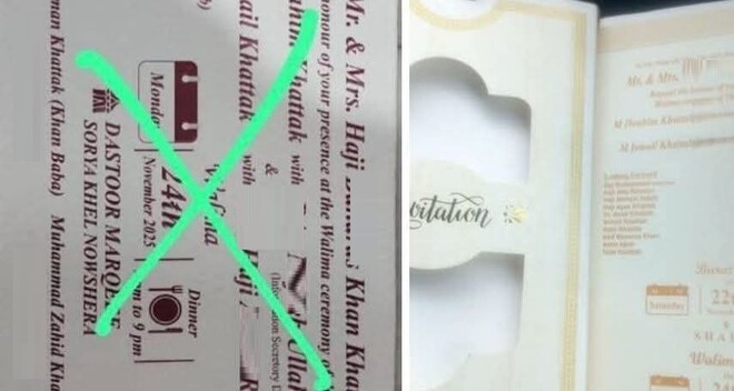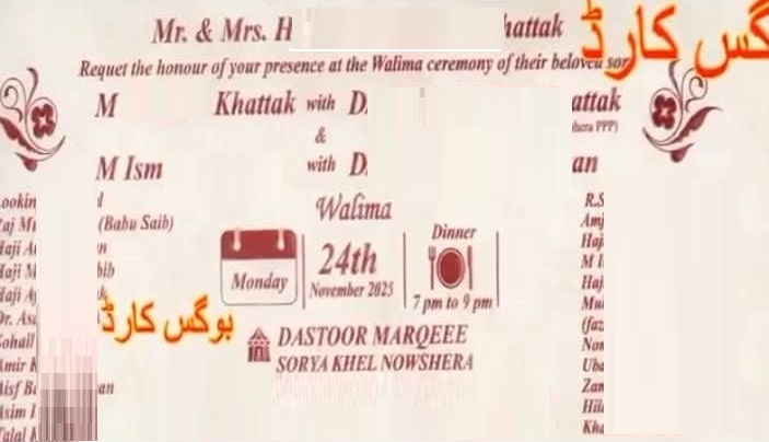 ’حریفوں کی سازش ہے‘، نوشہرہ میں دعوتِ ولیمہ کے جعلی کارڈز کی تقسیم