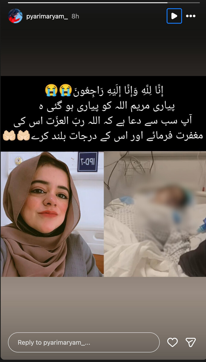 سوشل میڈیا پر گردش کرنے والی رپورٹس کے مطابق مریم زچگی کی حالت میں تھیں اور بچے کی پیدائش کے بعد حالت بگڑنے پر وفات پا گئیں۔