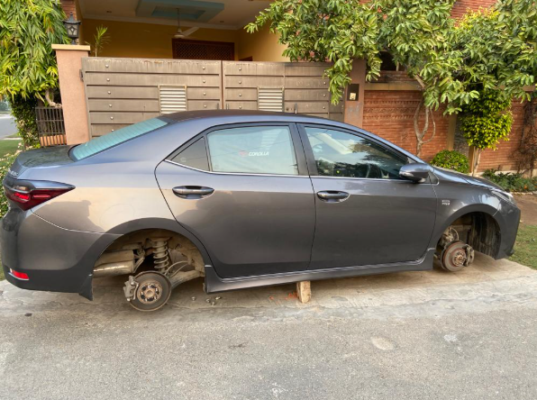 سوشل میڈیا پر سامنے آنے والی متعدد ویڈیوز اور تصاویر میں کاروں کو اینٹوں پر کھڑا دکھایا گیا ہے جبکہ ان کے تمام ٹائر غائب ہیں۔
