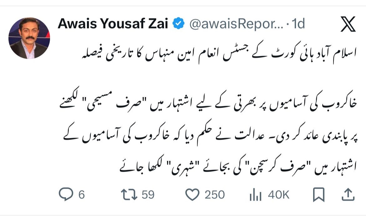 منگل کو ہمارے صحافی دوست اویس یوسفزئی نے دو تین انتہائی مختصر ٹویٹس کے ذریعے اطلاع دی کہ اسلام آباد ہائی کورٹ کے جسٹس انعام امین منہاس نے ایک تاریخی فیصلہ دیا ہے، اور وہ یہ کہ خاکروب کی آسامیوں پر بھرتی کے لیے اشتہار میں صرف ’مسیحی‘ لکھنے پر پابندی عائد کر دی گئی ہے۔