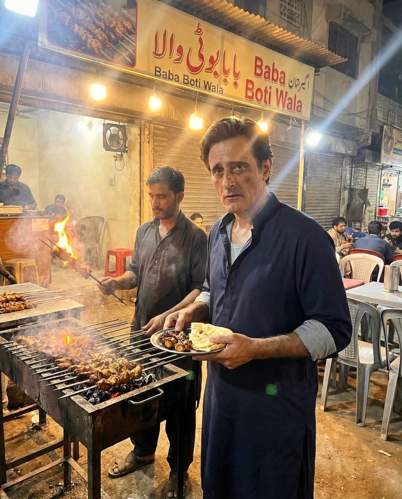 اے آئی سے تخلیق کی گئی ایک فوٹو میں اکشے کھنہ کو ایک تکہ بوٹی کی ریڑھی کے سامنے دکھایا گیا ہے جہاں وہ بظاہر تکہ بوٹی اور نان کھا رہے ہیں۔