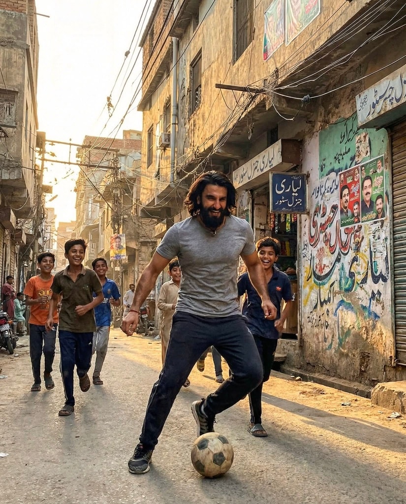 ایسی ہی ایک فوٹو میں رنویر سنگھ کسی گلی میں فُٹ بال کھیل رہے ہیں جبکہ لیاری کے بچے ان کے پیچھے پیچھے ہیں۔