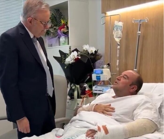آسٹریلوی وزیراعظم انتھونی البانیز نے حملہ آور کو قابو کرنے والے احمد الاحمد کی عیادت کی اور انہیں ہیرو قرار دیا (فوٹو: سکرین گریب)