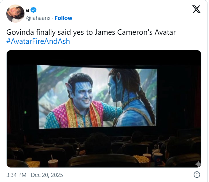 ایک ایکس صارف نے ایک طنزیہ پوسٹ میں لکھا کہ ’کہیں ایسا تو نہیں کہ جیمز کیمرون نے کسی نہ کسی طور گووندا کو اواتار تھری میں کیمیو کے لیے راضی کر لیا ہو۔‘