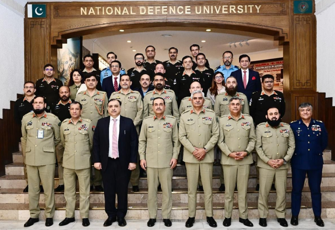 چیف آف ڈیفنس فورسز کا نیشنل ڈیفنس یونیورسٹی میں دیگر کے ہمراہ گروپ فوٹو۔ (آئی ایس پی آر)