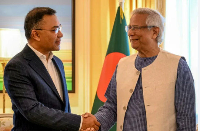 طارق رحمان نے بنگلہ دیش کی عبوری حکومت کے سربراہ محمد یونس سے ملاقات کی تھی (فوٹو: اے ایف پی)