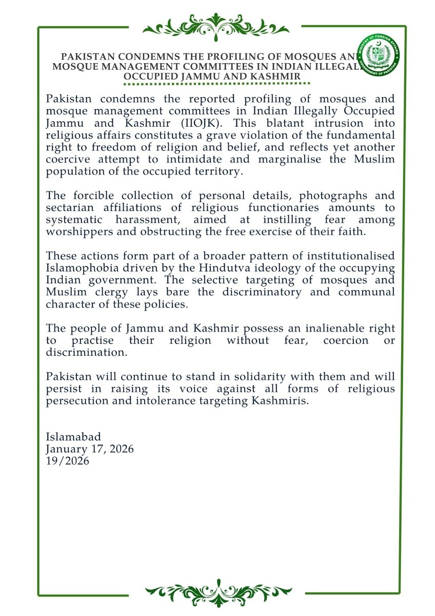 پاکستان کے دفتر خارجہ نے انڈیا کے زیرِانتظام کشمیر میں مساجد اور ان کی انتظامی کمیٹیوں کی مبینہ پروفائلنگ کے عمل کی سخت الفاظ میں مذمت کرتے ہوئے اسے مذہبی آزادیوں پر شب خون قرار دیا ہے۔