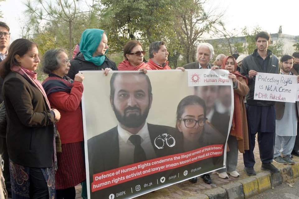ایمان مزاری اور ہادی علی کو سرینا ہوٹل کے باہر انڈر پاس کے قریب پولیس نے گرفتار کیا۔ دونوں ہائی کورٹ بار عہدیداران اور وکلا کے ہمراہ ڈسٹرکٹ کورٹس جا رہے تھے۔