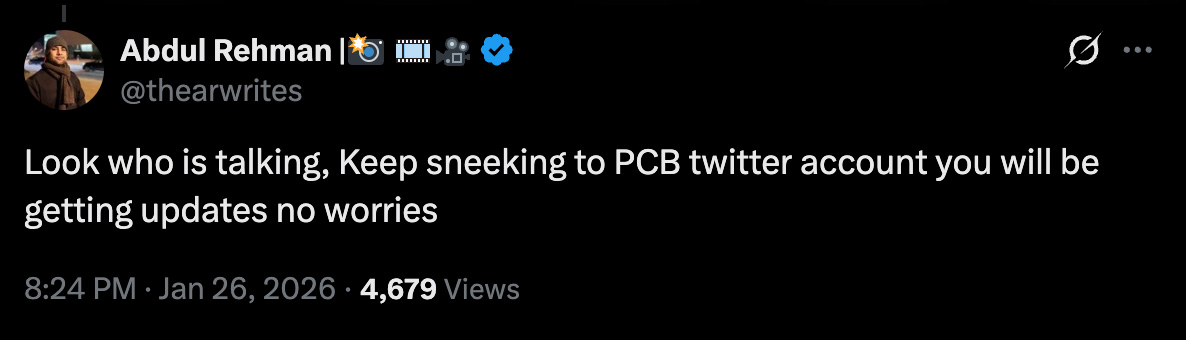 عبدالرحمان نے کہا ’یہ بات کون کہہ رہا ہے، ذرا دیکھو۔ پی سی بی کے ٹوئٹر اکاؤنٹ پر جھانکتے رہیں، اپڈیٹس ملتی رہیں گی، فکر کی کوئی بات نہیں۔‘