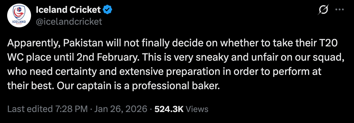 آئس لینڈ کرکٹ نے کہا کہ ’بظاہر پاکستان دو فروری تک یہ حتمی فیصلہ نہیں کرے گا کہ وہ ٹی20 ورلڈ کپ میں اپنی جگہ لے گا یا نہیں۔ یہ ہماری ٹیم کے ساتھ انتہائی چالاکی اور ناانصافی ہے، کیونکہ بہترین کارکردگی کے لیے ہمیں واضح صورتحال اور بھرپور تیاری کی ضرورت ہوتی ہے۔ ویسے بھی ہمارے کپتان ایک پروفیشنل بیکر ہیں۔‘