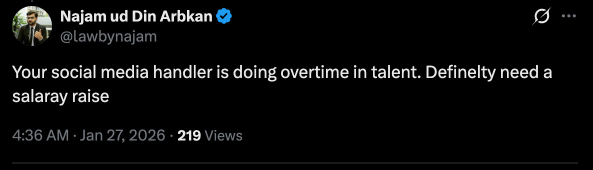 ایک اور صارف نے لکھا کہ ’آپ کا سوشل میڈیا ہینڈلر ٹیلنٹ میں اوور ٹائم کا کر رہا ہے، اس کی تو باقاعدہ تنخواہ بڑھانے کی ضرورت ہے۔‘