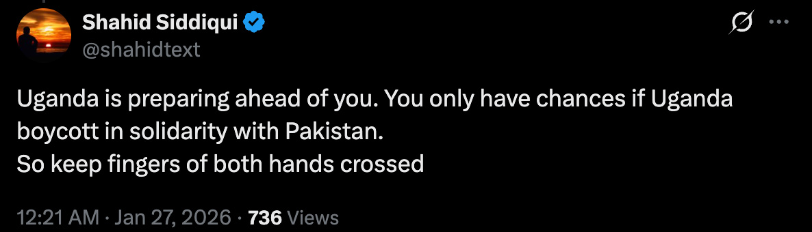 شاہد صدیقی نے لکھا ’یوگنڈا آپ سے پہلے تیاری کر رہا ہے۔ آپ کے پاس صرف اسی صورت موقع ہے اگر یوگنڈا پاکستان کے ساتھ اظہارِ یکجہتی میں بائیکاٹ کر دے۔ اس لیے دونوں ہاتھوں کی انگلیاں کراس کیے رکھو۔‘