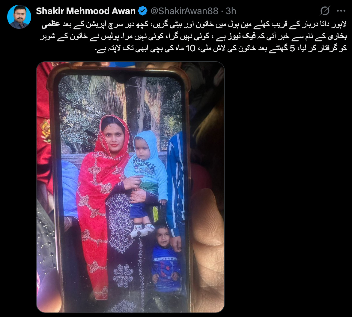 گزشتہ روز یہ واقعہ پیش آنے کے بعد سوشل میڈیا پر اس سانحے پر ہر جگہ بحث ہوتی رہی۔ اسی دوران متعدد ایسی پوسٹس بھی سامنے آئیں جن میں دعویٰ کیا گیا کہ پنجاب کی وزیرِ اطلاعات نے اس خبر کو ابتدائی طور پر جعلی قرار دیا تھا، تاہم بعد میں خاتون کی لاش ملنے کی تصدیق ہو گئی۔
