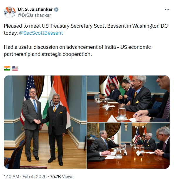 ایکس پر ایک اور بیان میں وزیرِ خارجہ جے شنکر نے کہا کہ وزیراعظم نریندر مودی اور صدر ڈونلڈ ٹرمپ کے درمیان گفتگو کے بعد دو طرفہ تجارت سے متعلق اعلانات کا خیرمقدم کرتے ہیں۔