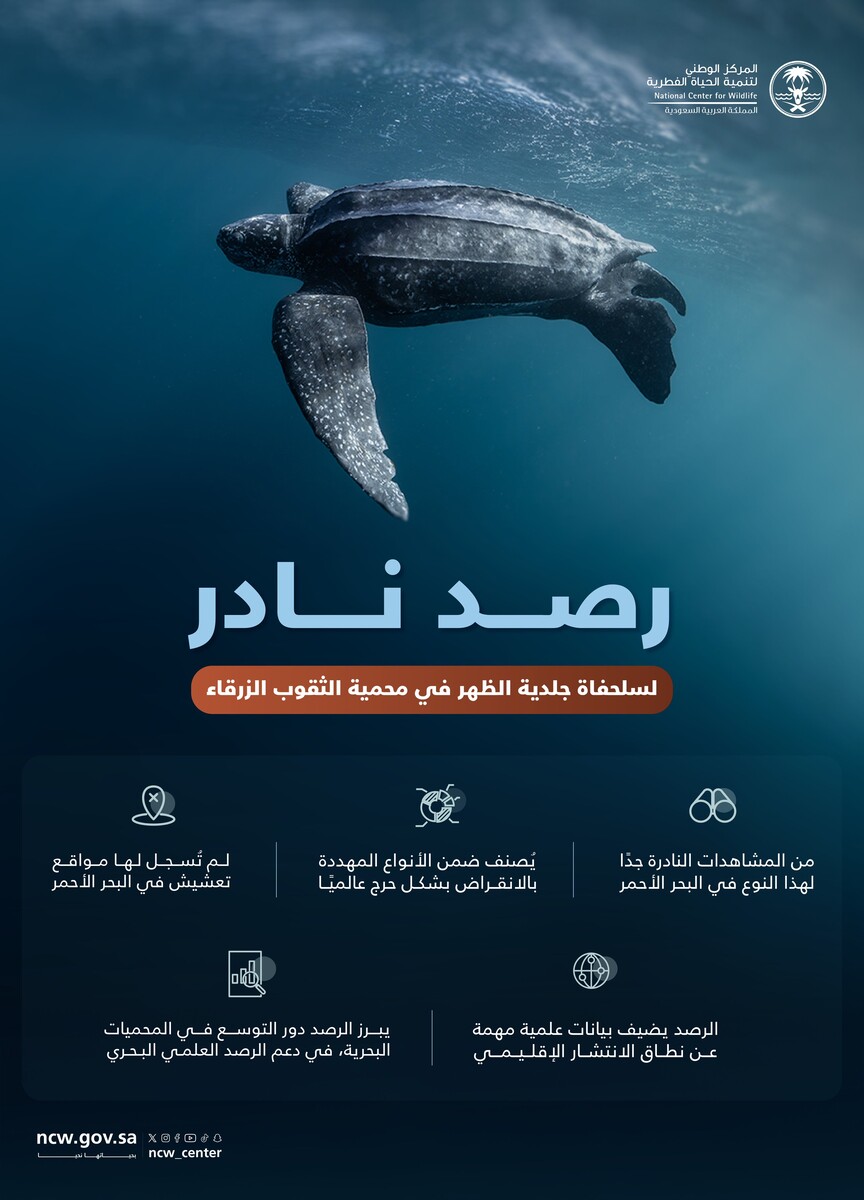 سعودی نیشنل سینٹر فار وائلڈ لائف نے بحیرہ احمر میں نایاب اور معدومیت کے شدید خطرے سے دوچار ’لیدر بیک سمندری کچھوے‘ کا منفرد مشاہدہ ریکارڈ کیا ہے۔