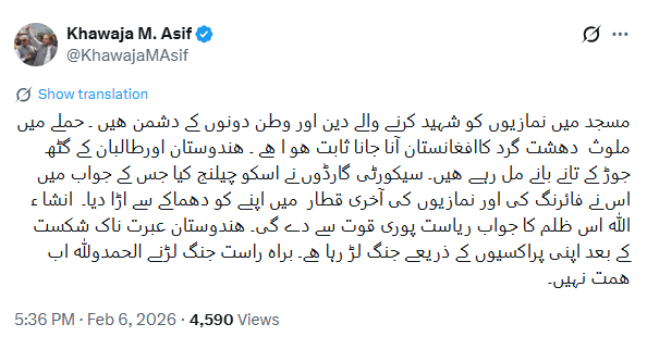 وزیر دفاع خواجہ آصف نے بھی اس حملے کی مذمت کرتے ہوئے کہا کہ ’ہندوستان اور طالبان کے گٹھ جوڑ کے تانے بانے مل رہے ہیں۔‘