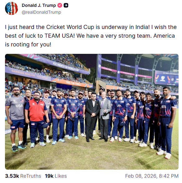 اتوار کو اپنے سوشل میڈیا پلیٹ فارم ٹروتھ پر ڈونلڈ ٹرمپ نے لکھا کہ ’مجھے ابھی پتہ چلا ہے کہ انڈیا میں ورلڈ کپ شروع ہو گیا ہے، میں امریکہ کی ٹیم کے لیے نیک خواہشات کا اظہار کرتا ہوں۔ ہمارے پاس ایک مضبوط ٹیم ہے اور پورا امریکہ آپ کے ساتھ ہے۔‘