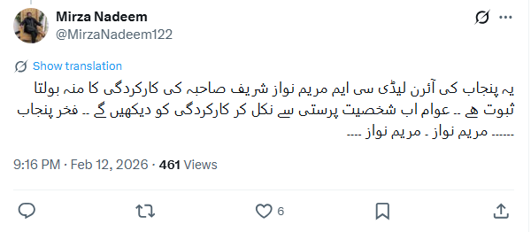 صارف مرزا ندیم نے لکھا کہ ’یہ پنجاب کی آئرن لیڈی مریم نواز کی کارکردگی کا منہ بولتا ثبوت ہے۔‘