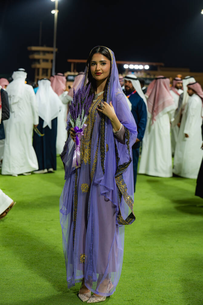 ایک مہمان نے عرب نیوز کو بتایا کہ ’میں اپنی ثقافت کو دکھانا چاہتی ہوں۔ اس لیے میں نے نجدی لباس پہنا ہے جو لیوینڈر رنگ کا ہے اور ہاتھ میں لیوینڈر کے پھول پکڑے ہیں۔‘