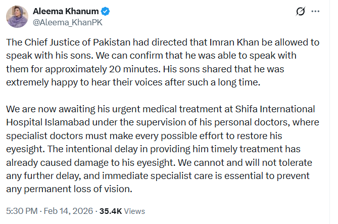 ان کے مطابق ’عمران خان کے بیٹوں نے بتایا کہ ایک طویل عرصے کے بعد اپنے والد کی آواز سن کر وہ بے حد خوش تھے۔‘ تاہم انہوں نے عمران خان کی بینائی کے حوالے سے خدشات کا اظہار کرتے ہوئے کہ کہ ’اب ہمیں شفاء انٹرنیشنل ہسپتال اسلام آباد میں ان کے ذاتی ڈاکٹروں کی زیرِ نگرانی ان کے فوری طبی علاج کا انتظار ہے، جہاں ماہر ڈاکٹروں کو ان کی بینائی کی بحالی کے لیے ہر ممکن کوشش کرنی چاہیے۔‘