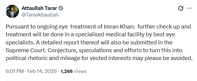 وفاقی وزیر اطلاعات عطا اللہ تارڑ نے سنیچر کو عمران خان کی صحت کے حوالے سے حکومتی موقف بیان کرتے ہوئے کہا ہے کہ ’عمران خان کی آنکھوں کے جاری علاج کے سلسلے میں ان کا مزید معائنہ اور علاج ماہرینِ چشم کے ذریعے ایک سپشلائزڈ طبی مرکز میں کیا جائے گا۔‘