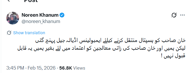 پی ٹی آئی کے بیان میں مزید کہا گیا ہے کہ ’ہم حکومت سے مطالبہ کرتے ہیں کہ عمران خان کا فوری طور پر ان کی فیملی اور ان کے ذاتی معالجین کی موجودگی میں علاج شروع کروایا جائے۔ اس کے علاوہ کسی بھی عمل کو ہم شفاف، قابلِ اعتماد اور قابلِ قبول نہیں سمجھیں گے۔‘