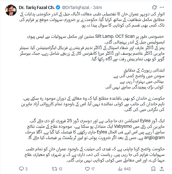 دوسری جانب وفاقی وزیر برائے پارلیمانی امور طارق فضل چوہدری نے ایکس پر اپنی پوسٹ میں کہا ہے کہ ’اتوار کی دوپہر عمران خان کا تفصیلی طبی معائنہ اڈیالہ جیل کے اندر حکومتی ہدایات کے مطابق مکمل شفافیت کے ساتھ کرایا گیا۔ حکومت نے ہر ضروری سہولت موقع پر فراہم کی تاکہ کسی بھی قسم کی کوتاہی کا سوال پیدا نہ ہو۔‘