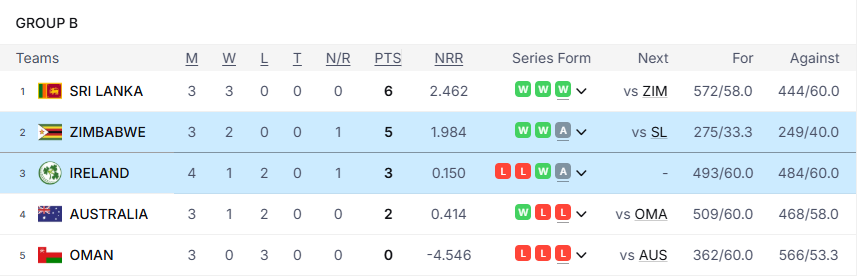 یوں گروپ بی میں زمبابوے پانچ پوائنٹس کے ساتھ اگلے مرحلے میں جگہ بنانے میں کامیاب ہو گیا، جبکہ آئرلینڈ چار میچوں میں تین پوائنٹس کے ساتھ ایونٹ سے باہر ہو گیا۔