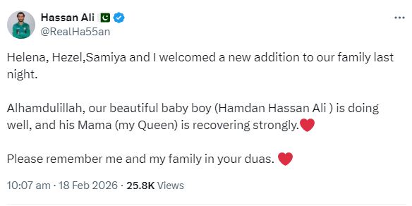 بدھ کو سماجی رابطے کی ویب سائٹ ایکس پر ایک پوسٹ میں حسن علی کا کہنا تھا کہ نومولود بیٹے کا نام ’ہمدان حسن علی‘ رکھا گیا ہے۔