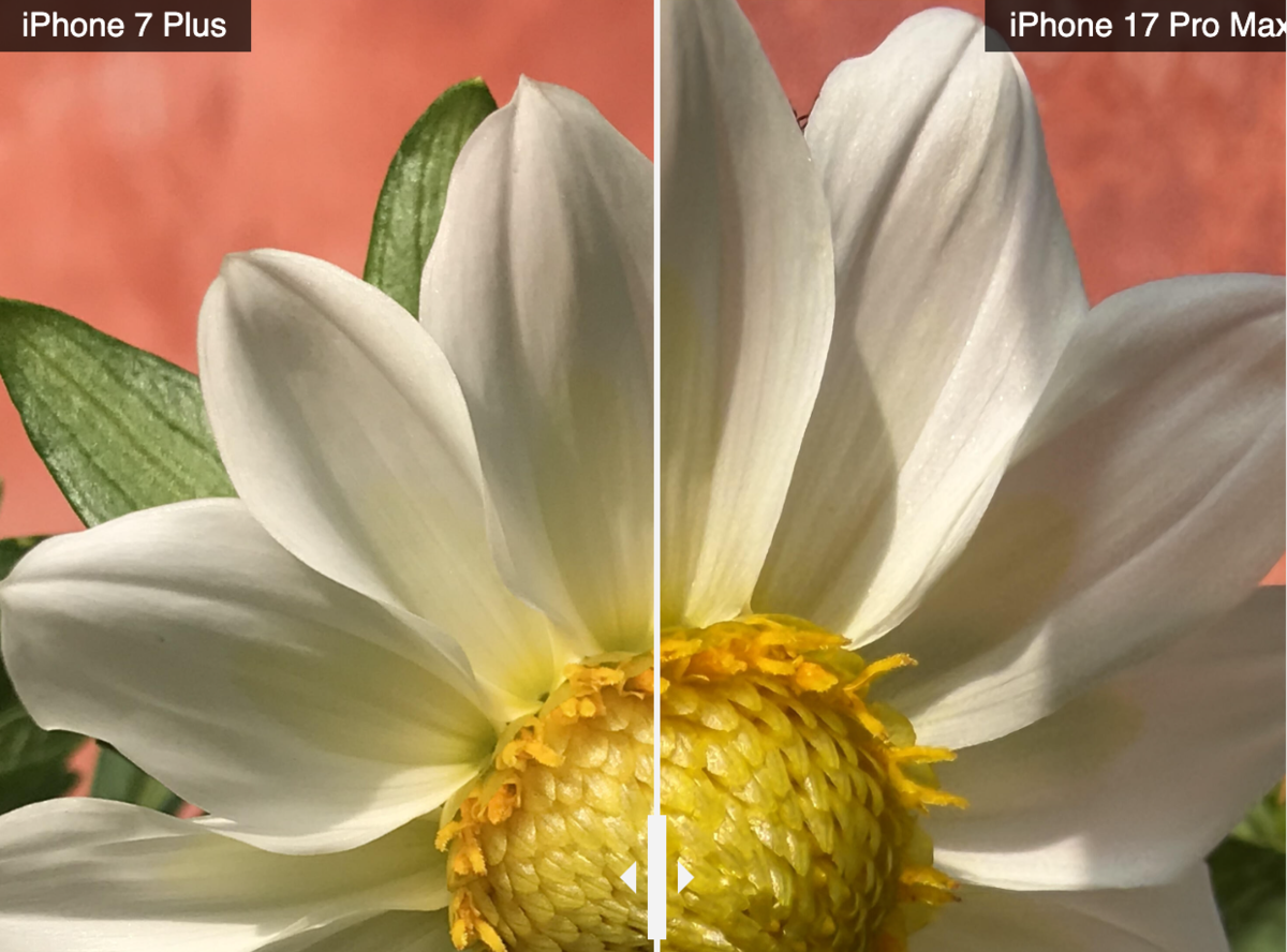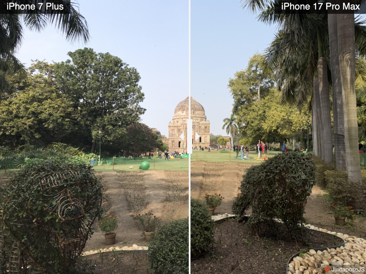 آئی فون 7 پلس کا بنیادی لینز آئی فون 17 پرو میکس کے کیمرے کی نسبت کچھ کم فیلڈ آف ویو رکھتا ہے، جس کی وجہ سے 17 پرو میکس کے ساتھ ایک ہی فاصلے سے زیادہ منظر کو کیپچر کیا جا سکتا ہے۔