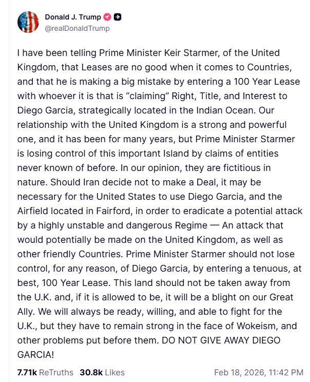 گذشتہ روز بدھ کو صدر ٹرمپ نے اپنے سوشل میڈیا پلیٹ فارم ٹروتھ سوشل پر ایک بیان میں ایک بار پھر ایران پر ممکنہ حملے کا عندیہ دیا۔ انہوں نے برطانیہ کو بحرِ ہند میں واقع چاگوس جزائر پر خودمختاری ترک کرنے سے خبردار کرتے ہوئے کہا کہ اگر ایران کسی معاہدے پر آمادہ نہ ہوا تو جزیرہ نما کے ڈیگو گارشیا فضائی اڈے کی ضرورت پڑ سکتی ہے تاکہ ’انتہائی غیرمستحکم اور خطرناک حکومت کی ممکنہ جارحیت کو ختم کیا جا سکے۔‘