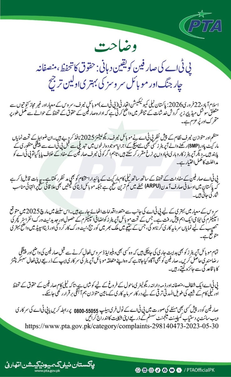 ادارے کے مطابق مارچ 2026 میں متوقع سپیکٹرم نیلامی کے بعد نیٹ ورک کی کارکردگی اور ڈیٹا سپیڈ میں بہتری کی توقع ہے، جس سے صارفین کو بہتر خدمات فراہم کی جا سکیں گی۔ اس کے ساتھ ہی موبائل آپریٹرز کو بھی یہ ہدایت کی گئی ہے کہ کسی بھی ویلیو ایڈڈ سروس کو فعال کرنے سے قبل صارف کی واضح رضامندی حاصل کی جائے۔