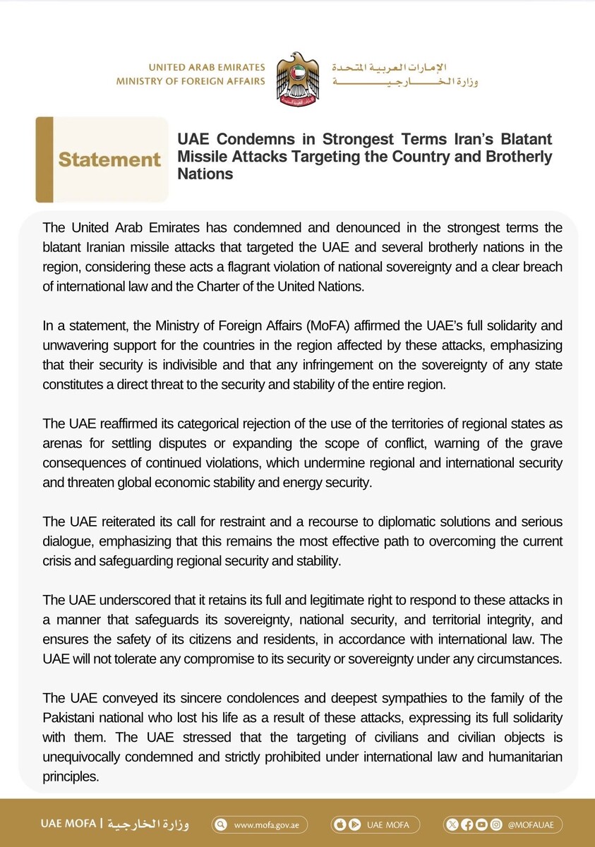متحدہ عرب امارات کی وزارت خارجہ کی جانب سے سنیچر کو ایکس پر جاری کردہ ایک بیان میں کہا گیا ہے کہ ’متحدہ عرب امارات ان حملوں کے نتیجے میں اپنی جان سے جانے والے پاکستانی شہری کے اہلخانہ سے تعزیت اور دلی ہمدردری کا اظہار کرتا ہے۔ ہم ان سے مکمل یکجہتی کا اظہار کرتے ہیں۔‘
