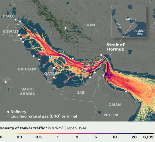 انشورنس کمپنیوں کو انٹیلی جنس سروسز فراہم کرنے والے ادارے سکائی ٹیک کی جانب سے ایکس پر ایک پوسٹ میں بتایا گیا ہے کہ ’100 سے زائد کنٹینر شپس، ساڑھے چار سو آئل اینڈ گیس ٹینکرز اور 200 کیریئرز اس وقت آبنائے ہرمز کے اندر ہیں اور ممکنہ طور پر پھنسنے کے خطرات سے دوچار ہیں۔‘