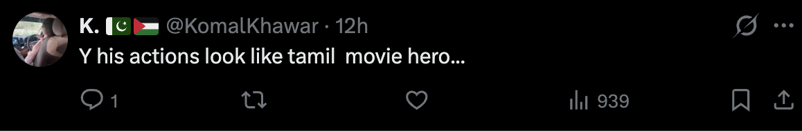 کومل خاور نے لکھا ’ان کا ایکشن تو کسی تامل فلم کے ہیرو جیسا تھا۔‘