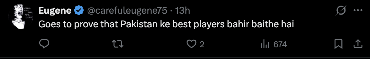 ایک اور صارف نے لکھا ’اس سے یہ ثابت ہوتا ہے کہ پاکستان کے بہترین پلیئرز تو ٹیم سے باہر بیٹھے ہیں۔‘