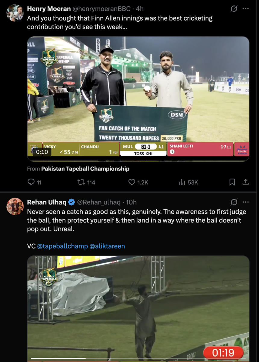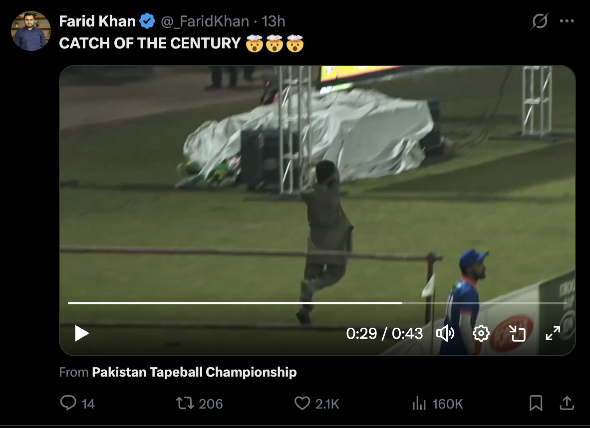 کرکٹ کی تاریخ میں آپ نے سٹیڈیم کی نشستوں میں بیٹھے شائقین کی جانب سے کئی حیران کن کیچز دیکھے ہوں گے، مگر حال ہی میں ایک ٹیپ بال ٹورنامنٹ میں شائق کی جانب سے پکڑا جانے والا کیچ پوری دنیا کی توجہ اپنی جانب مبذول کر چکا ہے۔